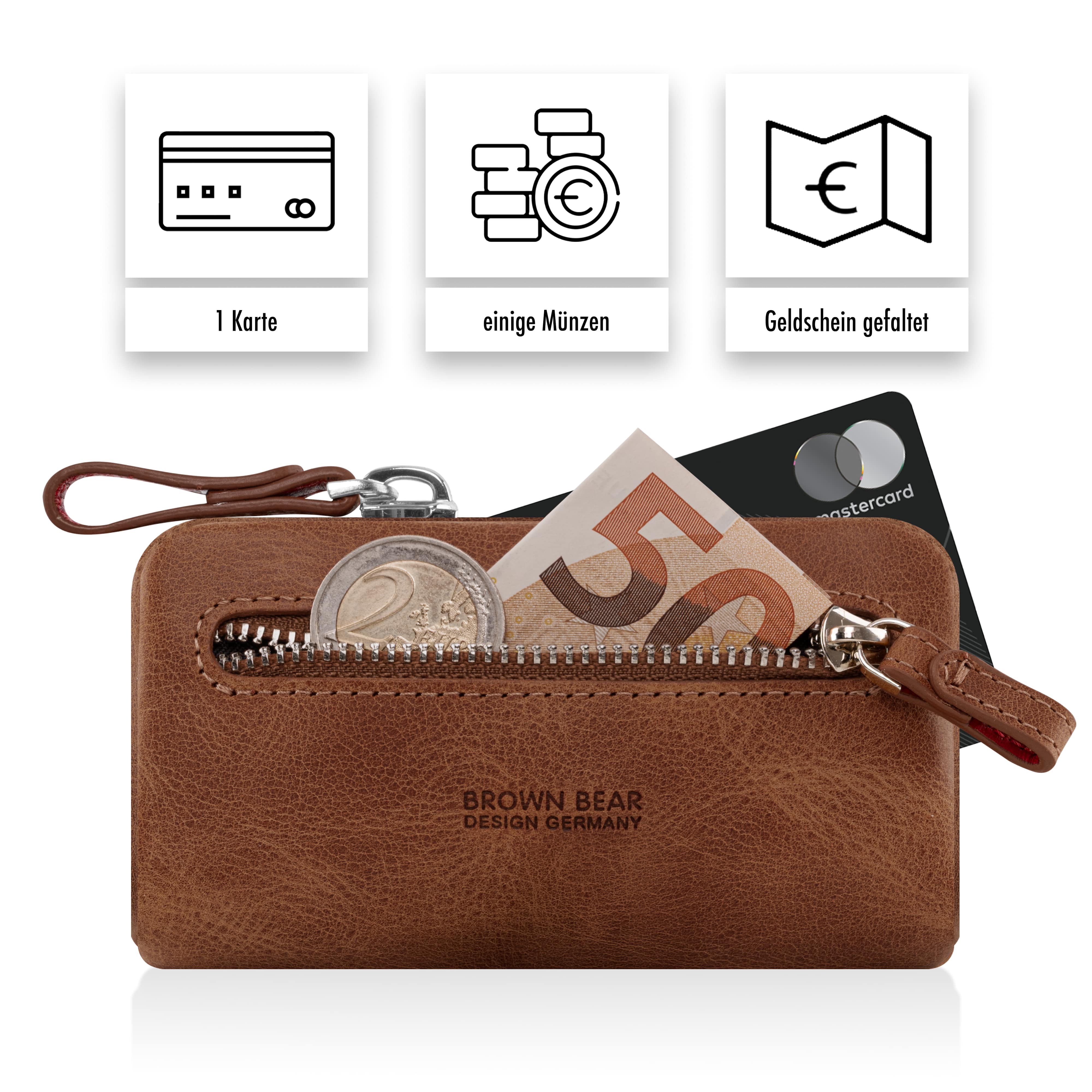 Zwei stabile Schlüsselringe mit Ketten bieten sicheren Halt für Auto-, Haus- oder Büroschlüssel. Zusätzlich gibt es Platz für eine Kreditkarte (Empfehlung: Schutzhülle) sowie ein Reißverschlussfach für Münzen oder gefaltete Geldscheine.