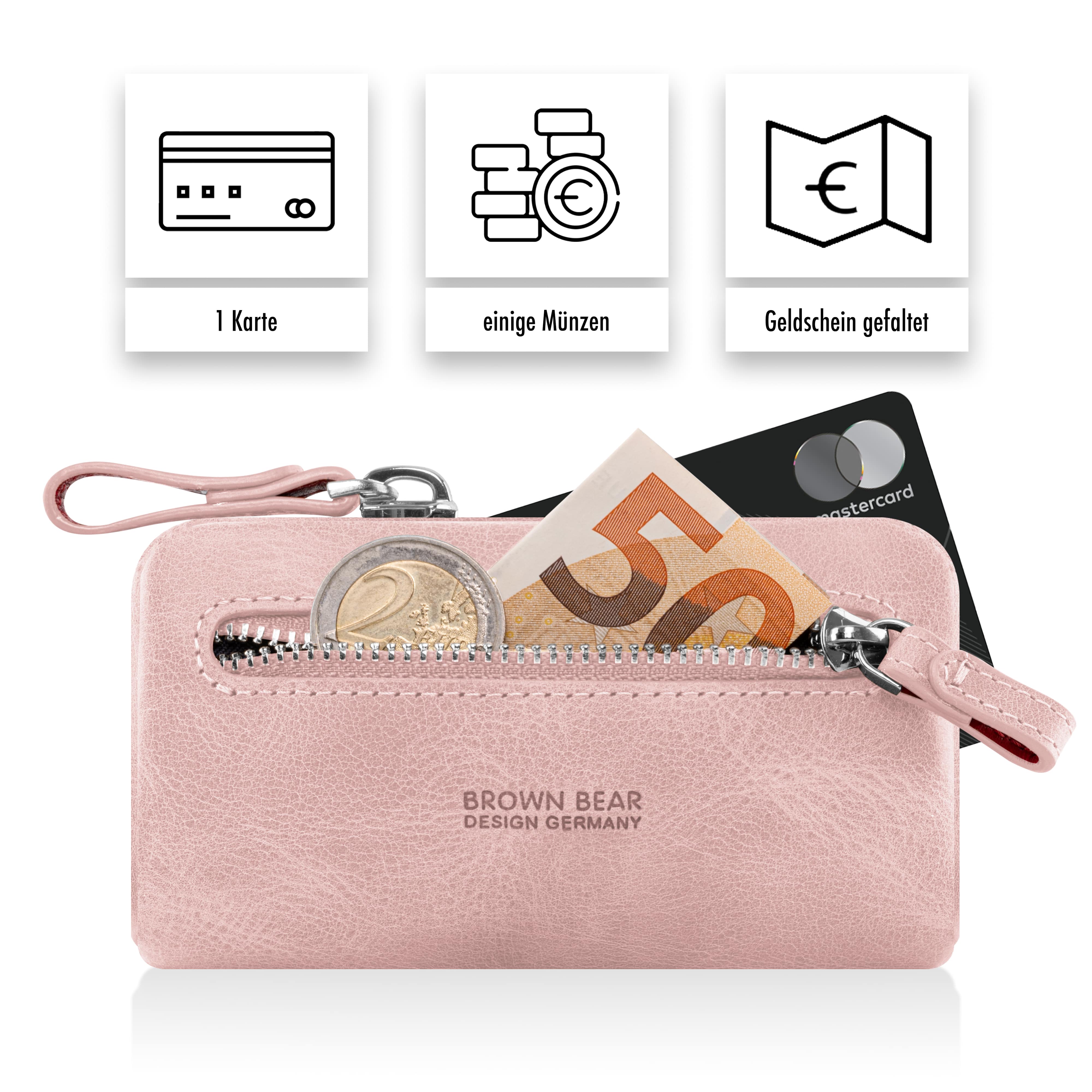 Zwei stabile Schlüsselringe mit Ketten bieten sicheren Halt für Auto-, Haus- oder Büroschlüssel. Zusätzlich gibt es Platz für eine Kreditkarte (Empfehlung: Schutzhülle) sowie ein Reißverschlussfach für Münzen oder gefaltete Geldscheine.