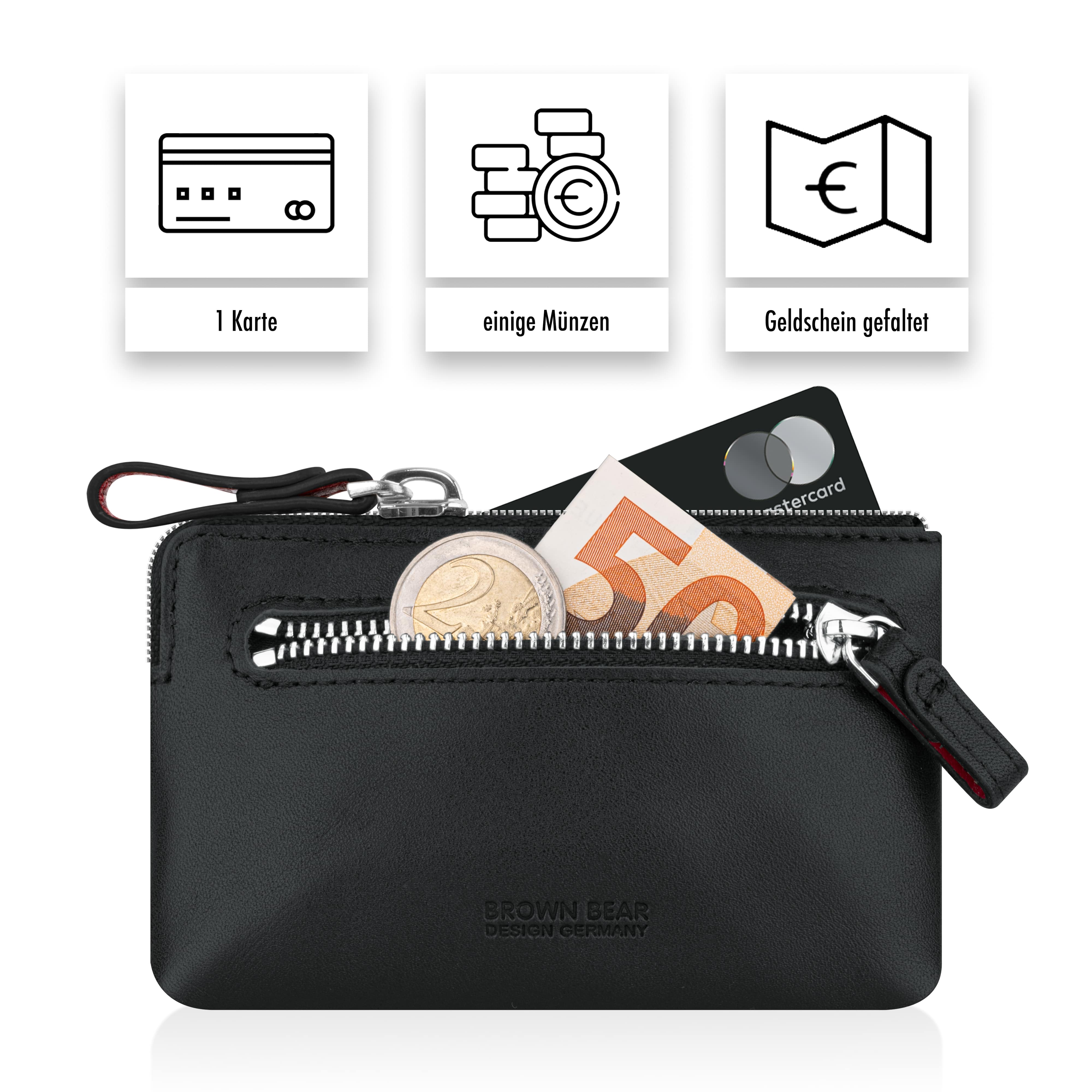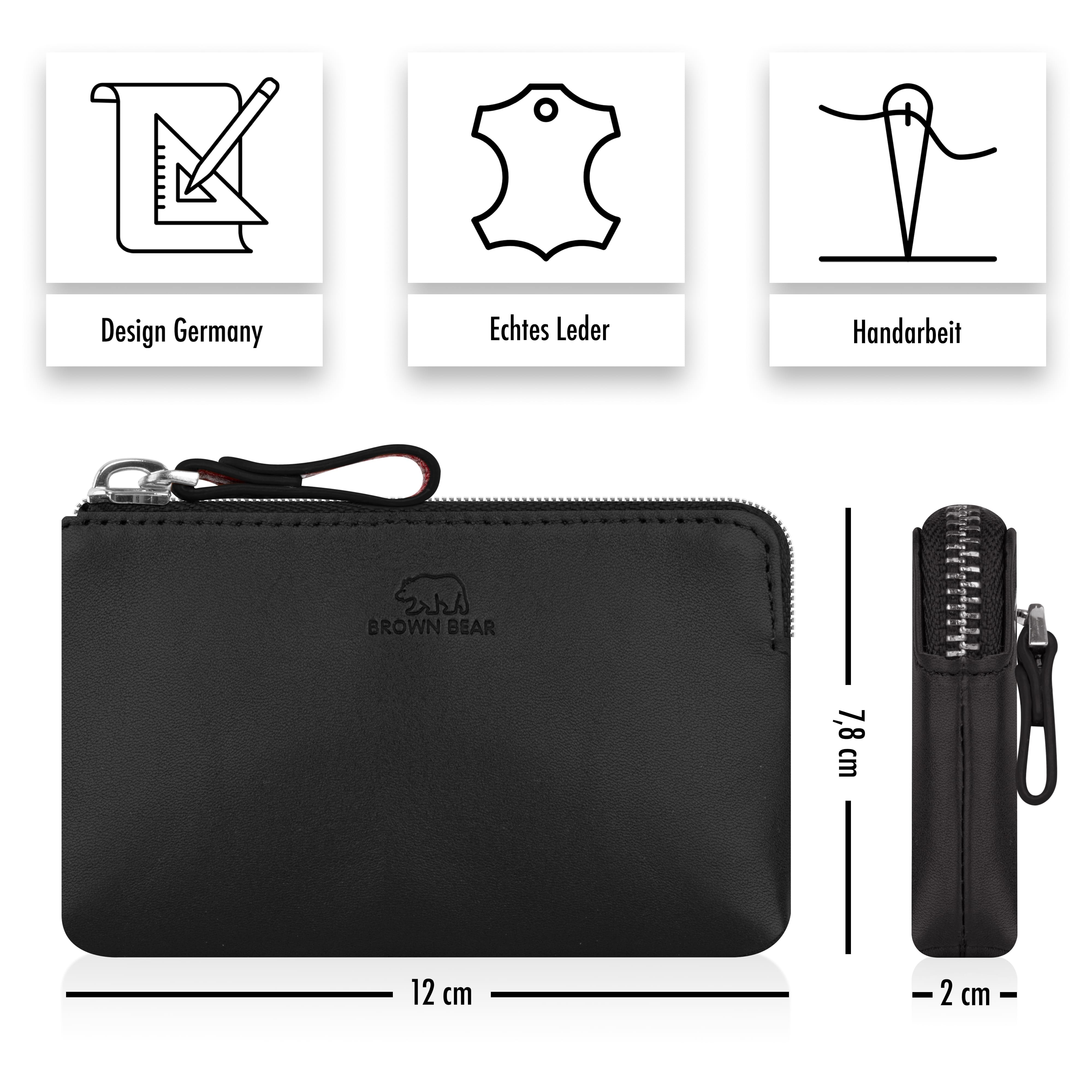Zwei stabile Schlüsselringe mit Ketten bieten sicheren Halt für Auto-, Haus- oder Büroschlüssel. Zusätzlich gibt es Platz für eine Kreditkarte (Empfehlung: Schutzhülle) sowie ein Reißverschlussfach für Münzen oder gefaltete Geldscheine.