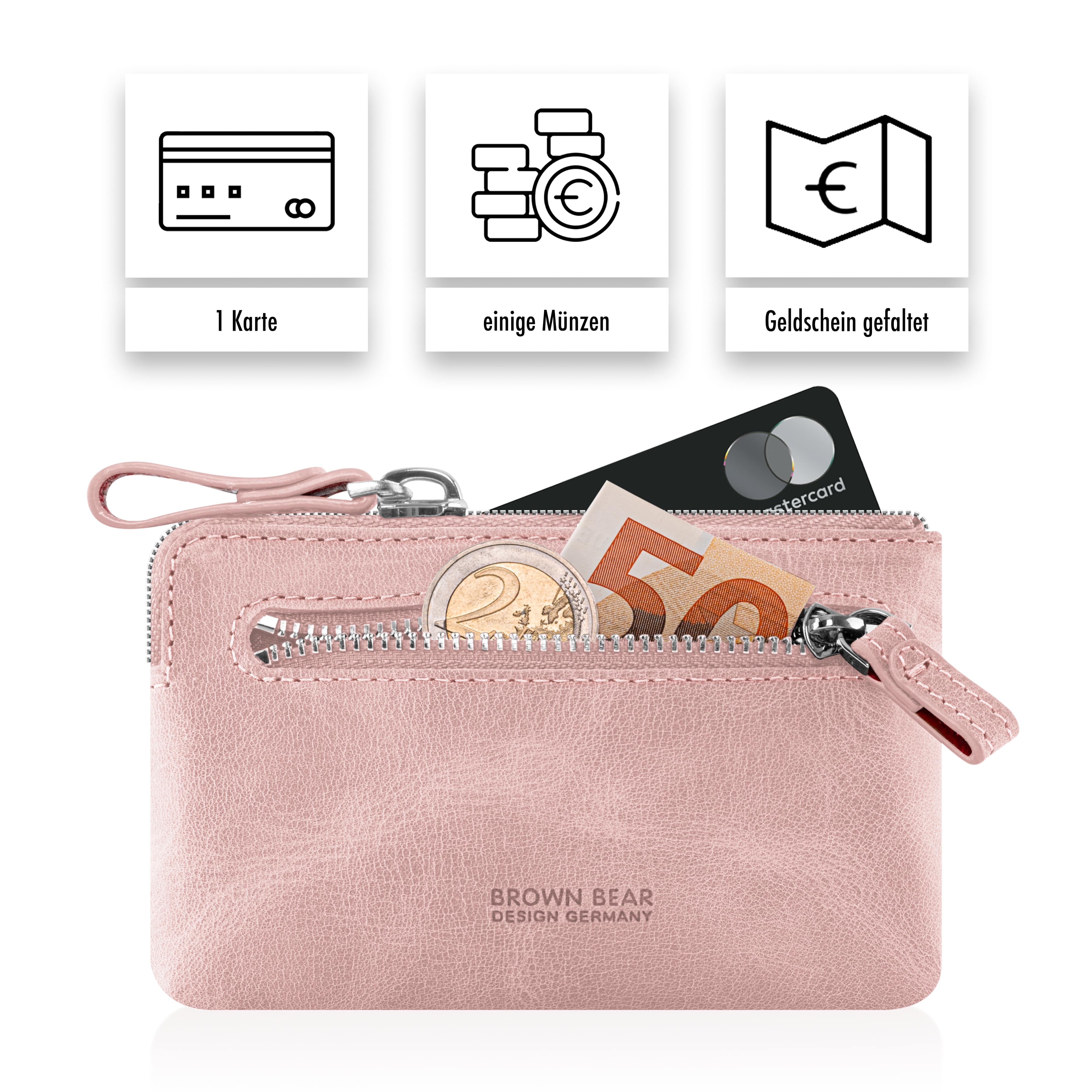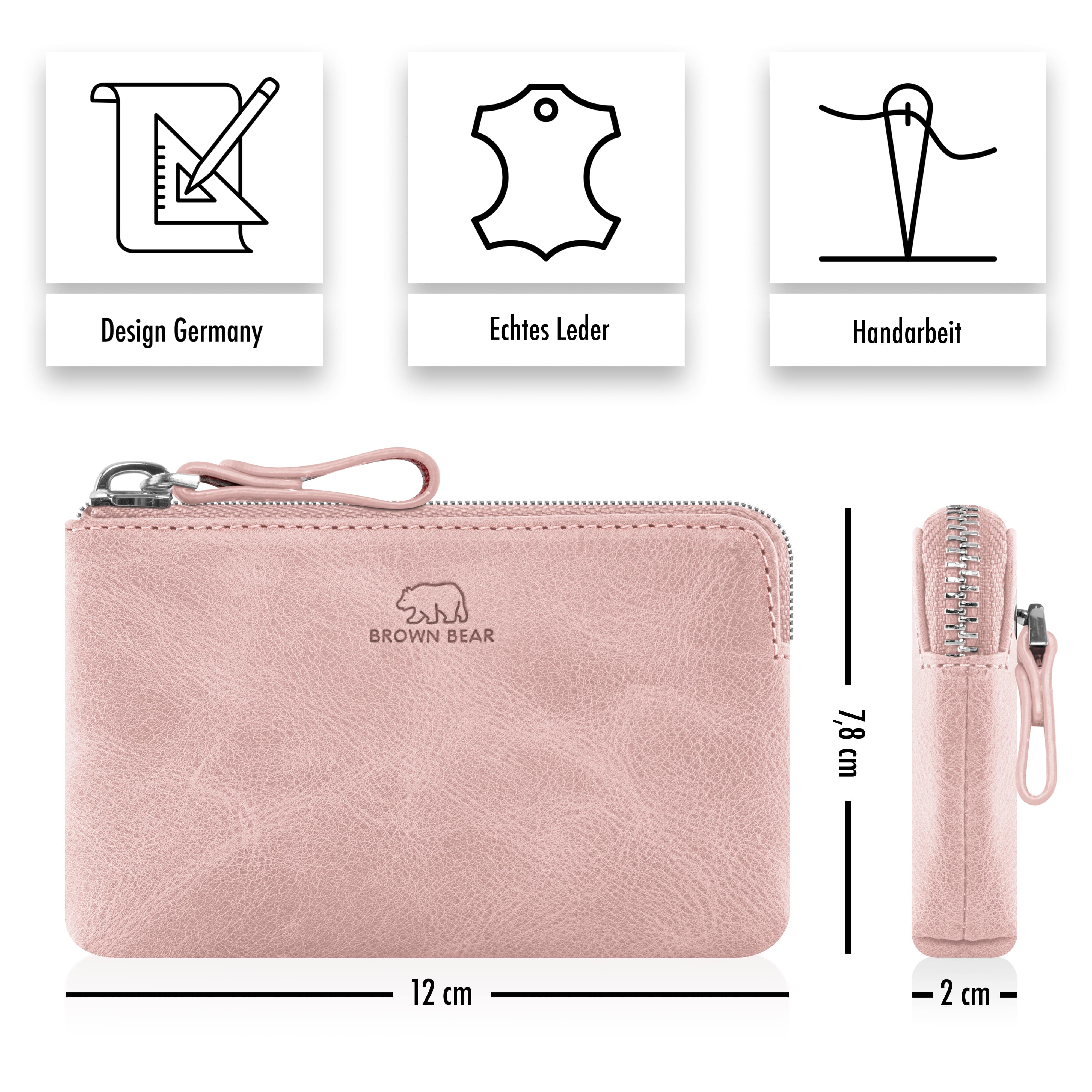 Zwei stabile Schlüsselringe mit Ketten bieten sicheren Halt für Auto-, Haus- oder Büroschlüssel. Zusätzlich gibt es Platz für eine Kreditkarte (Empfehlung: Schutzhülle) sowie ein Reißverschlussfach für Münzen oder gefaltete Geldscheine.