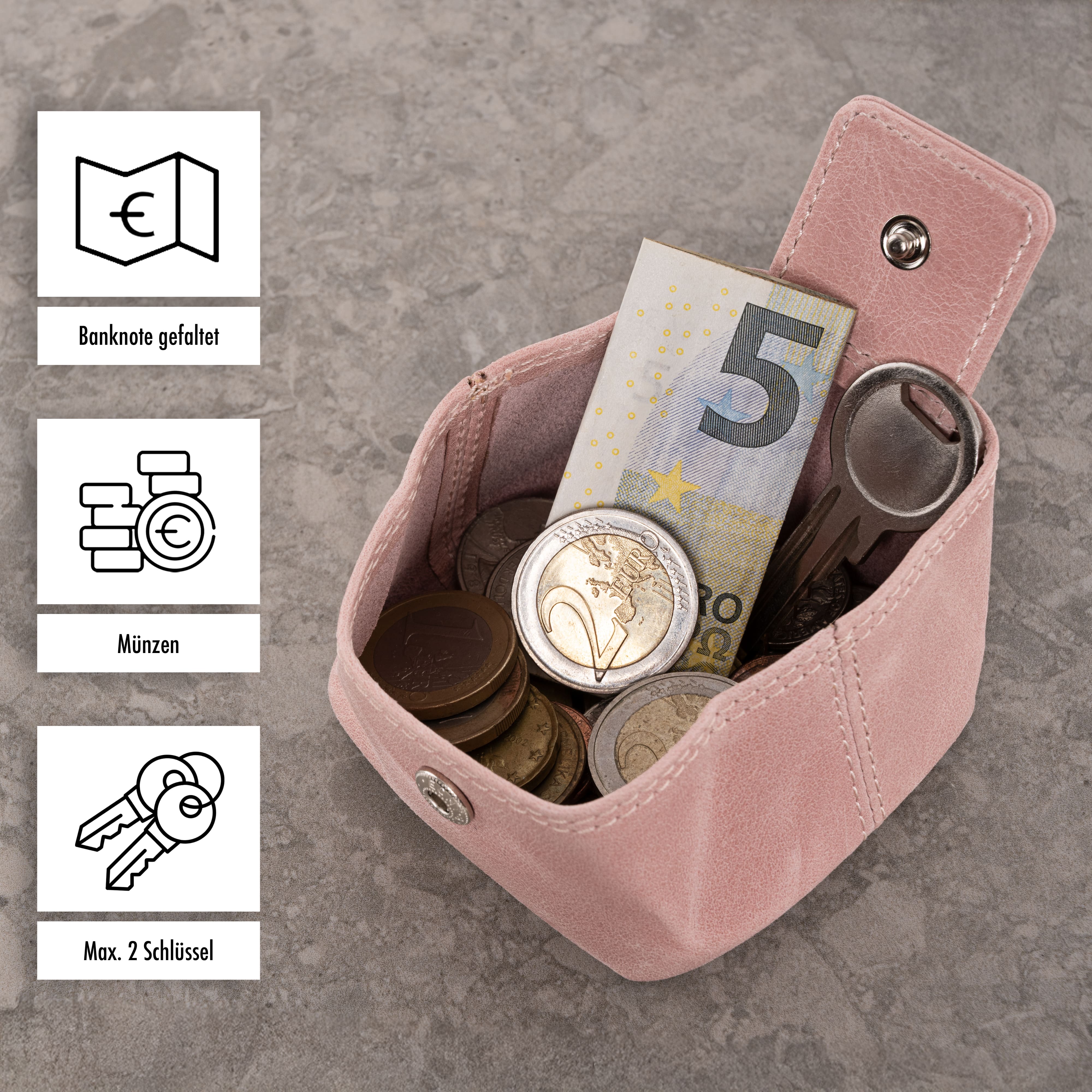 Platz für Münzen, Schlüssel & Geldschein