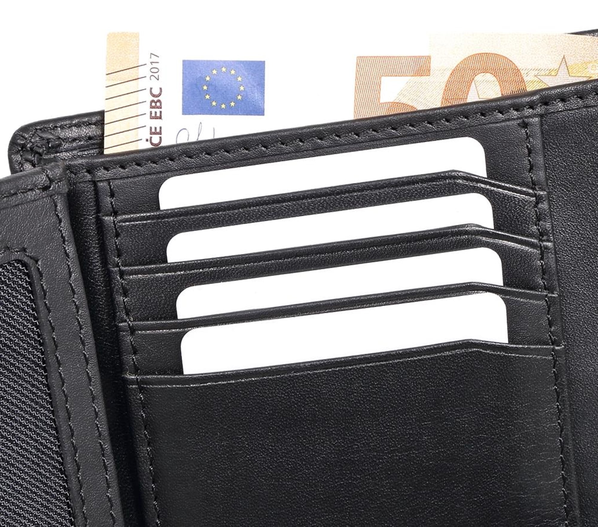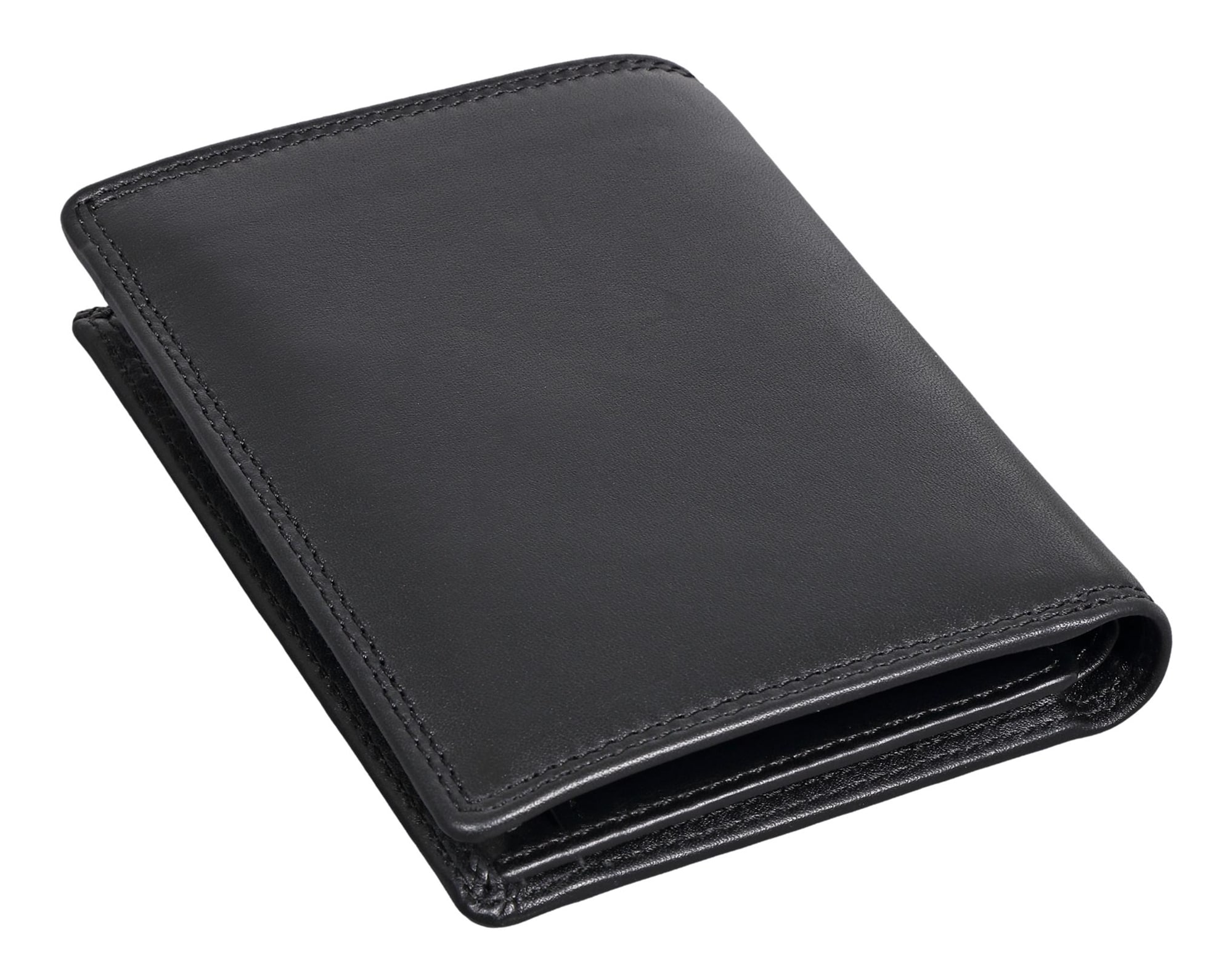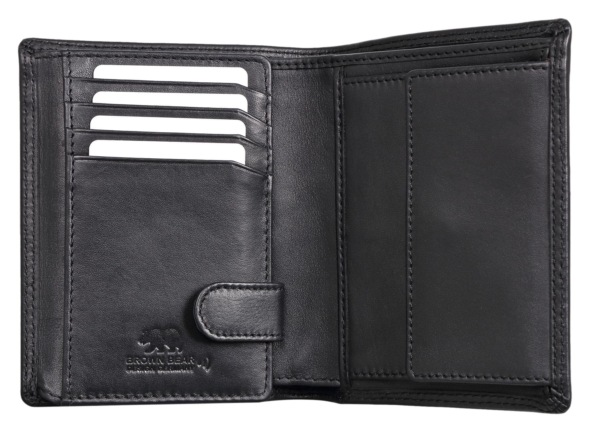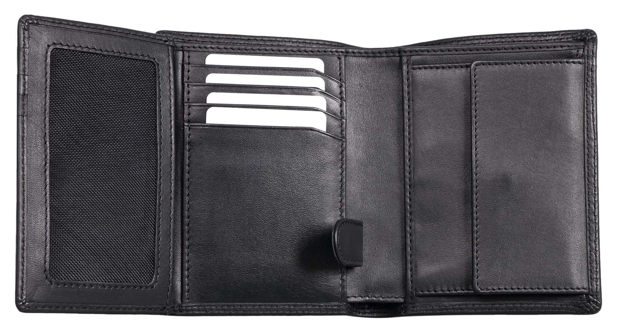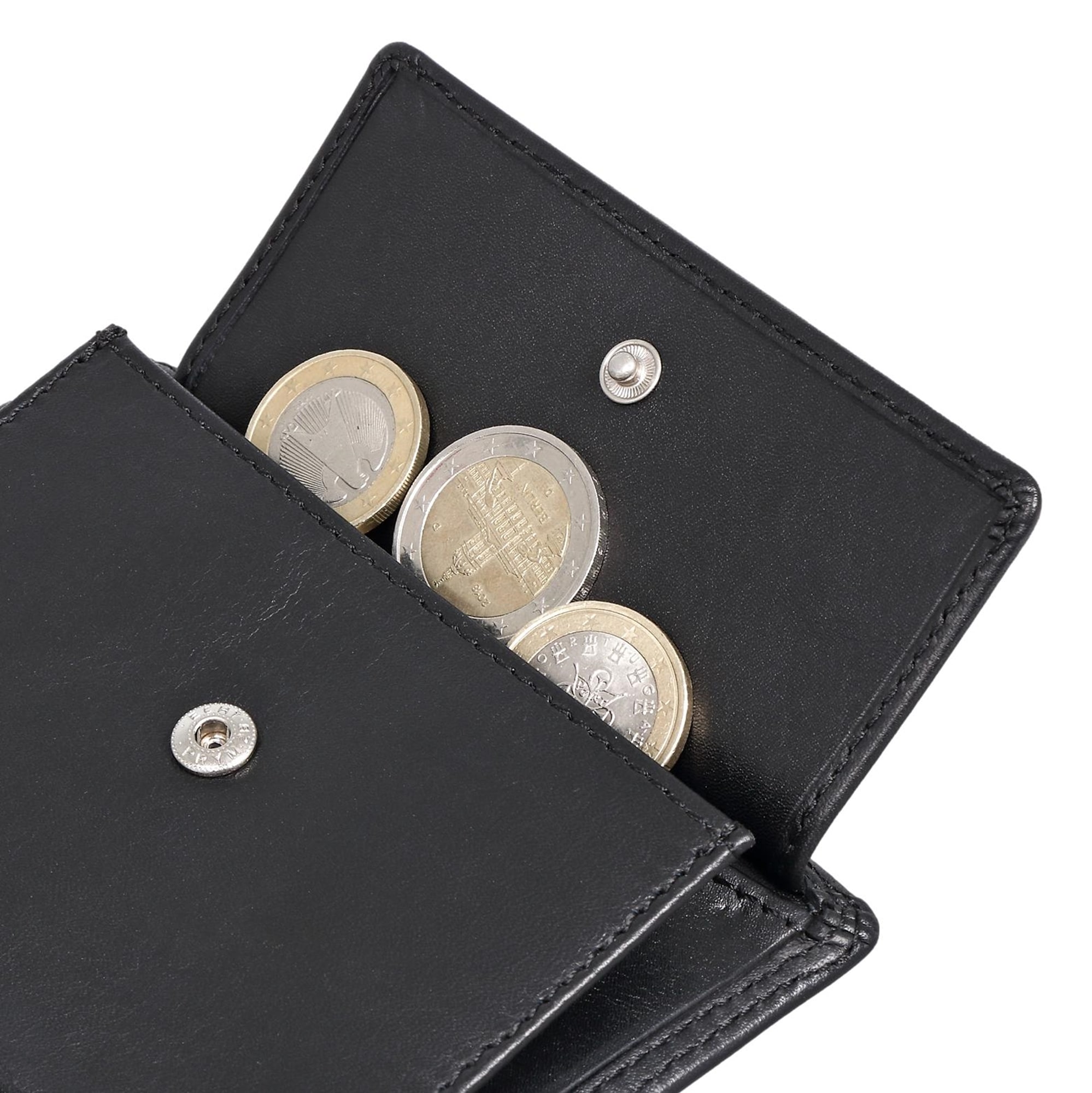 Die Innenaufteilung bietet zahlreiche Fächer für Karten, Ausweisdokumente und Fotos. Zwei separate Scheinfächer und ein Münzfach mit Druckknopf sorgen für Übersicht und Ordnung.