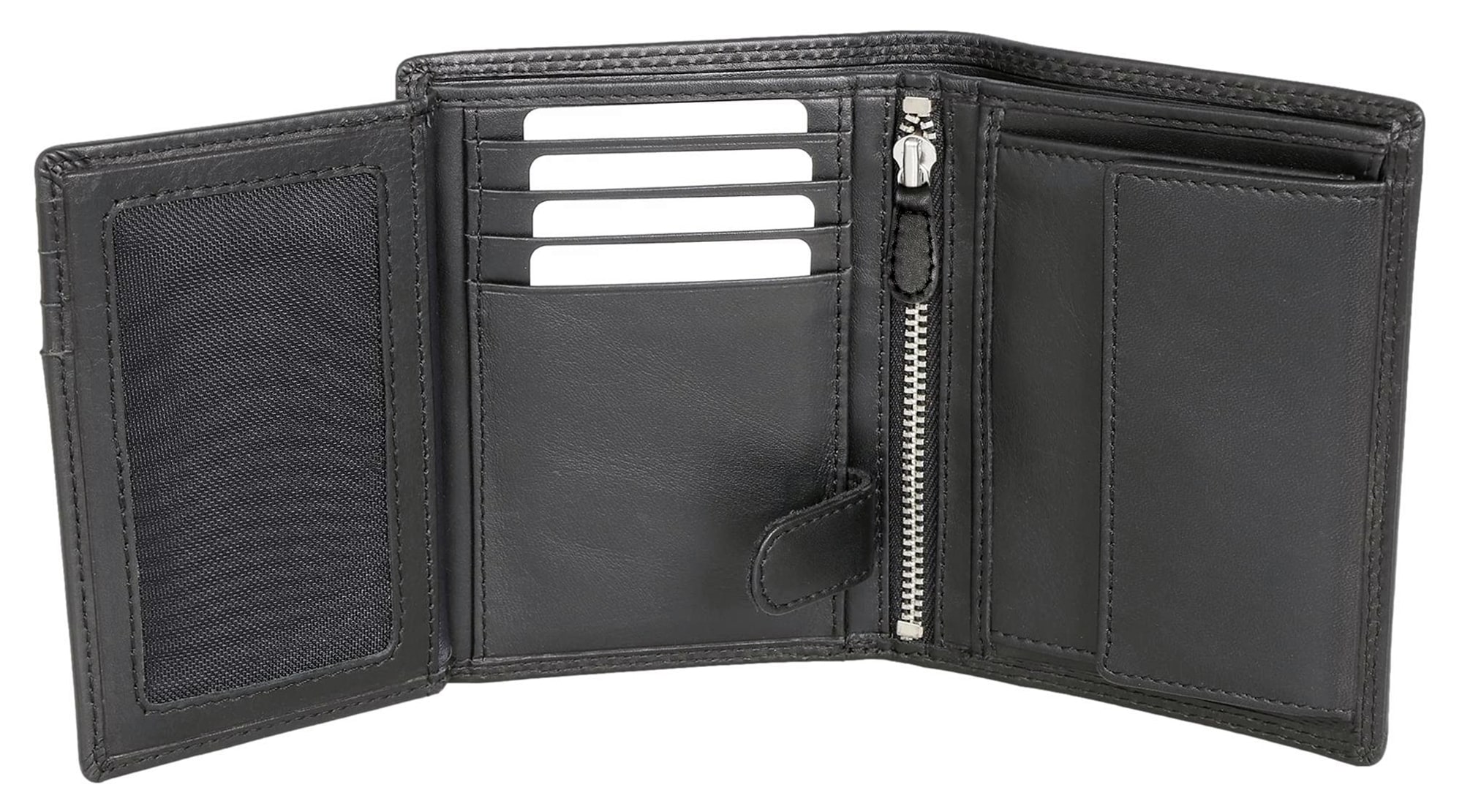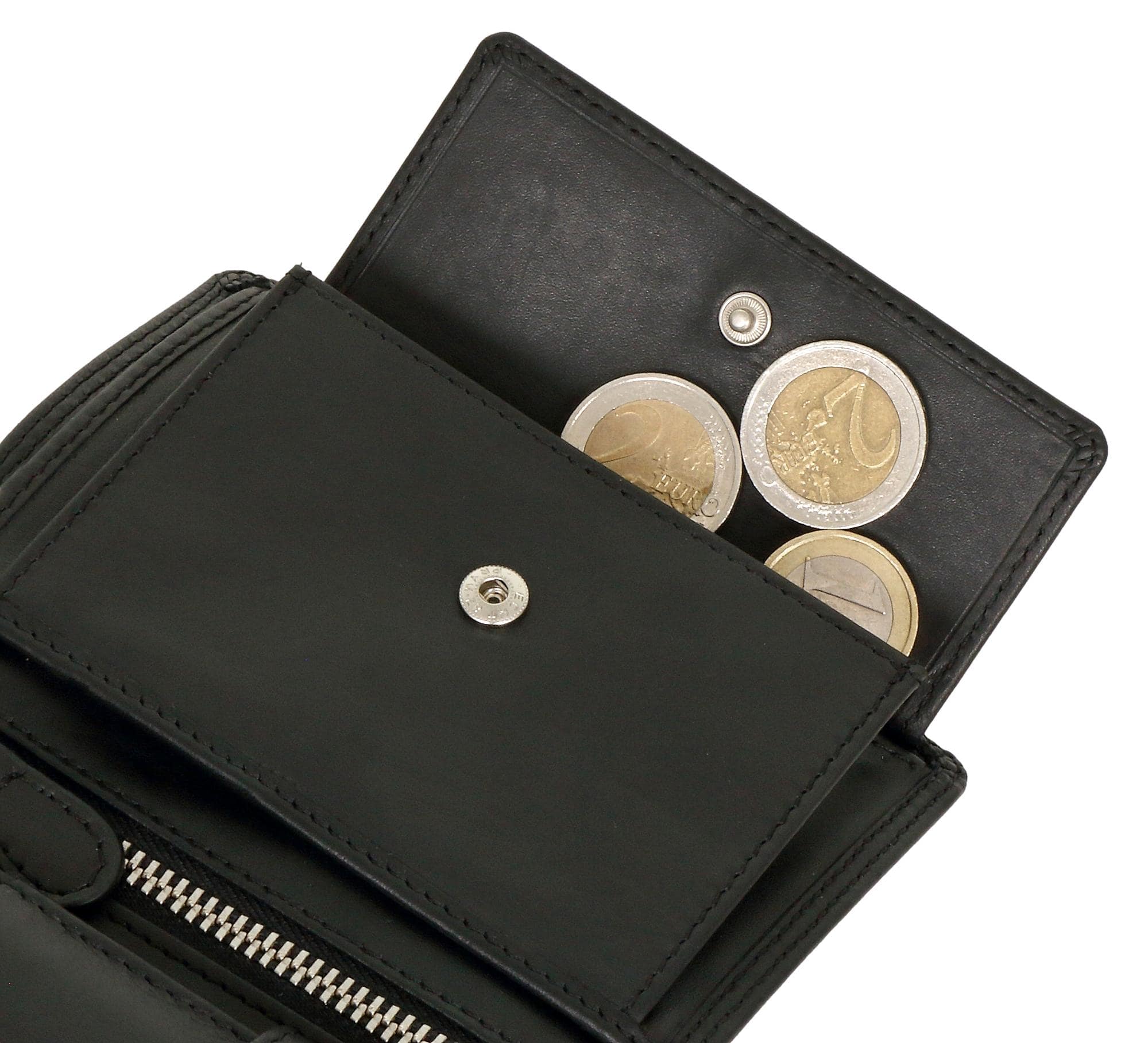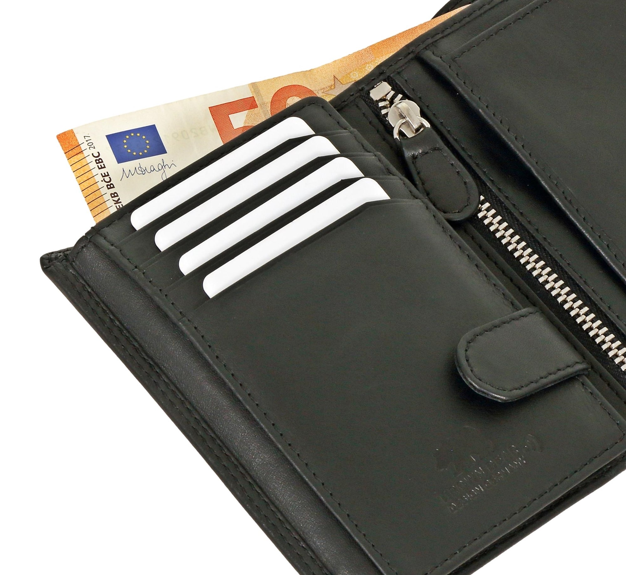Die durchdachte Innenaufteilung sorgt für maximale Übersicht und Ordnung: Zahlreiche Kartenfächer, ein Münzfach mit praktischem Druckknopfverschluss, zwei separate Scheinfächer sowie ein Reißverschlussinnenfach bieten ausreichend Platz für alle wichtigen Inhalte.