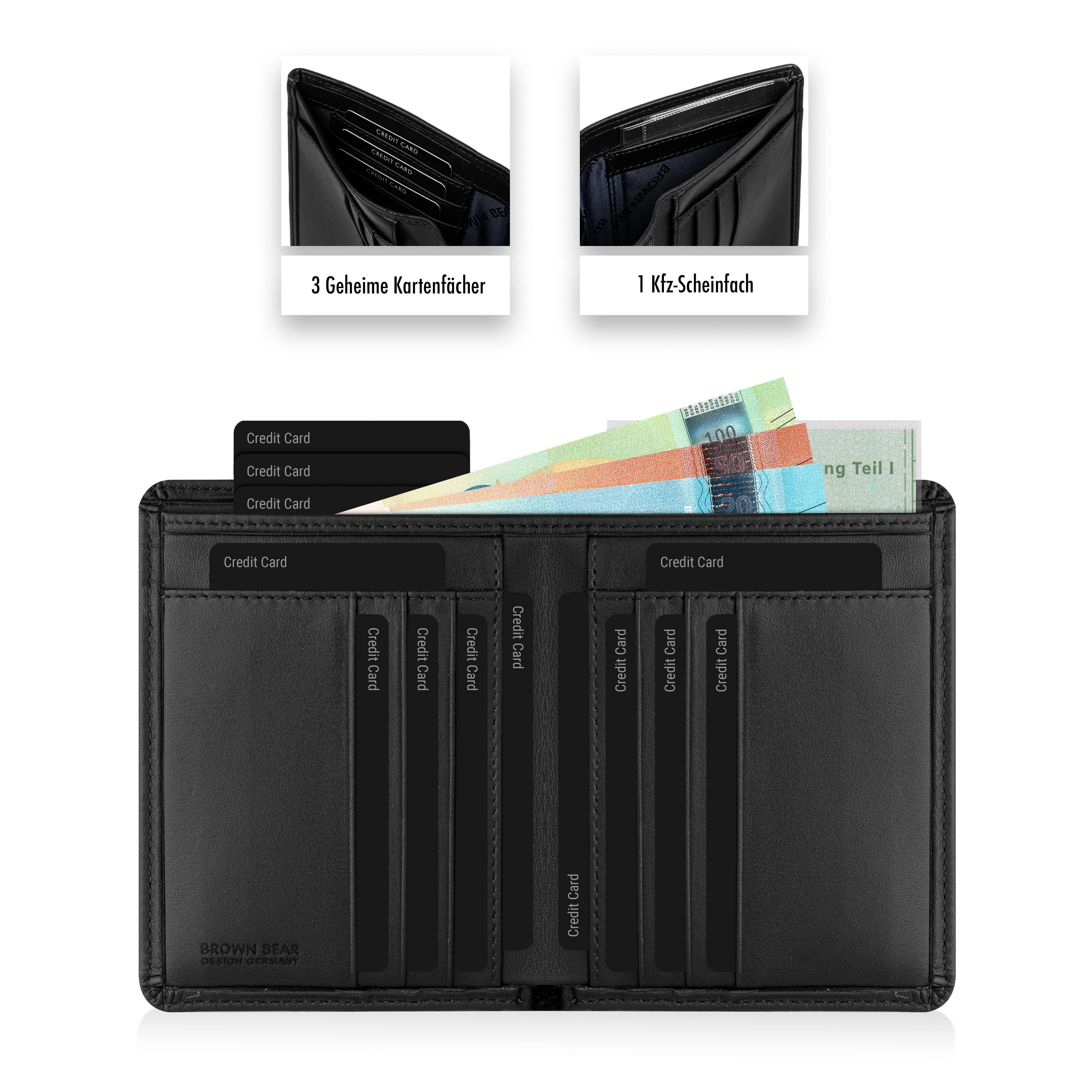 9 Kartenfächer, 4 Ausweis-/Kreditkartenfächer, 1 Scheinfach