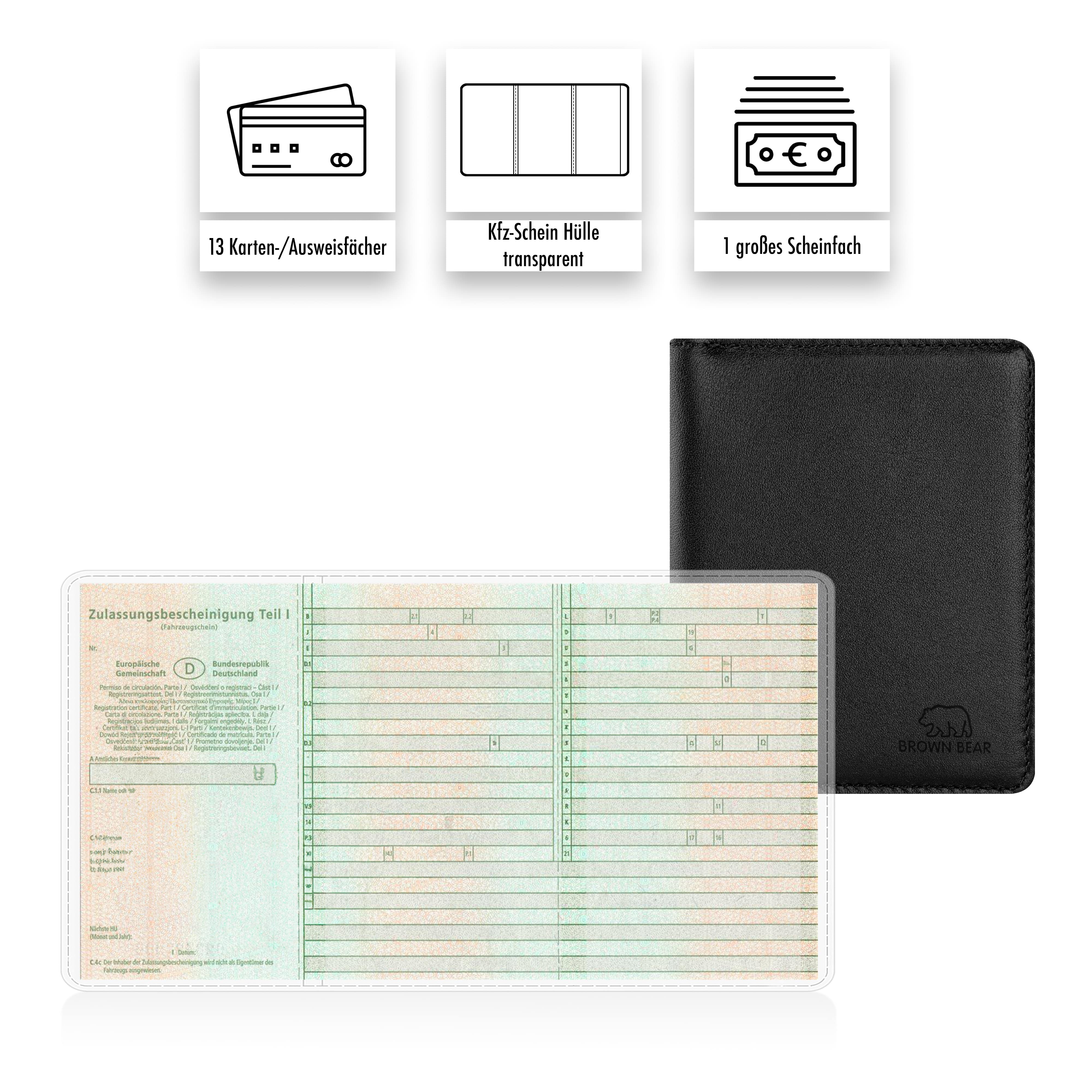 9 Kartenfächer, 4 zusätzliche Ausweis-/Kreditkartenfächer, 1 großes Scheinfach sowie eine transparente Hülle mit separatem Fach für den Fahrzeugschein.