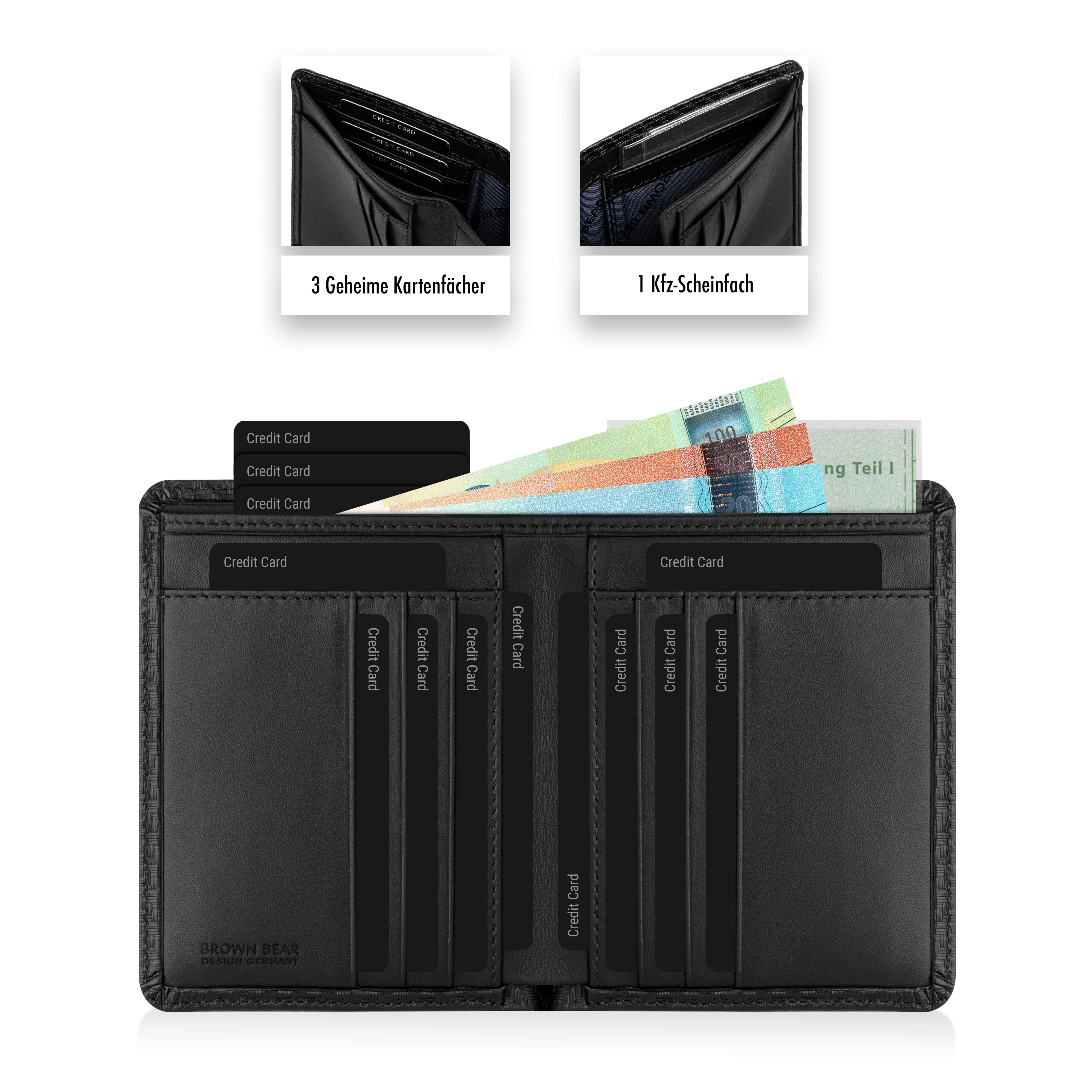 9 Kartenfächer, 4 Ausweis-/Kreditkartenfächer, 1 Scheinfach