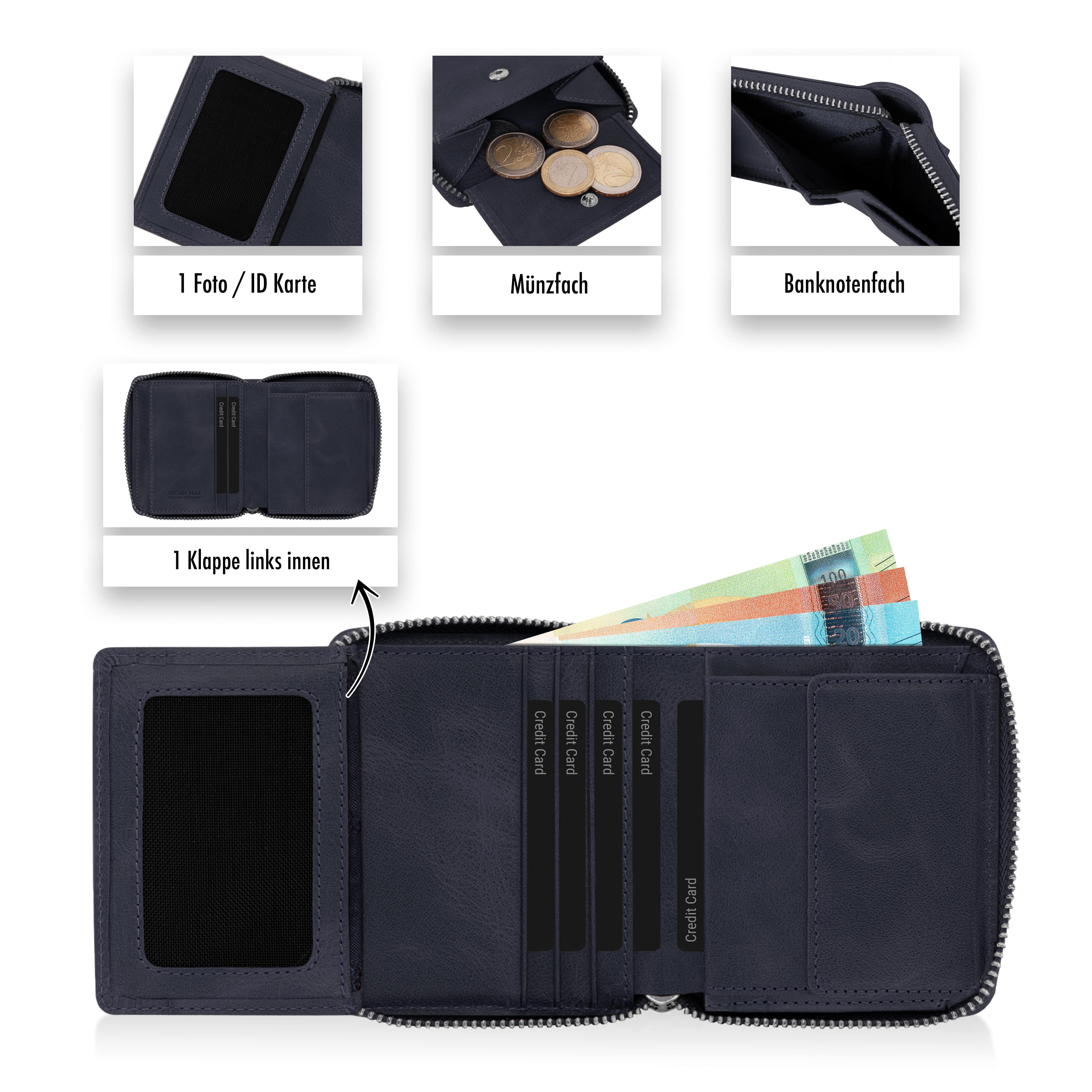 Das kompakte Slim Wallet bietet Platz für 7 Kartenfächer, ein Netzfach für Ausweis oder Foto, ein Geldscheinfach sowie ein Münzfach mit Druckknopf.
