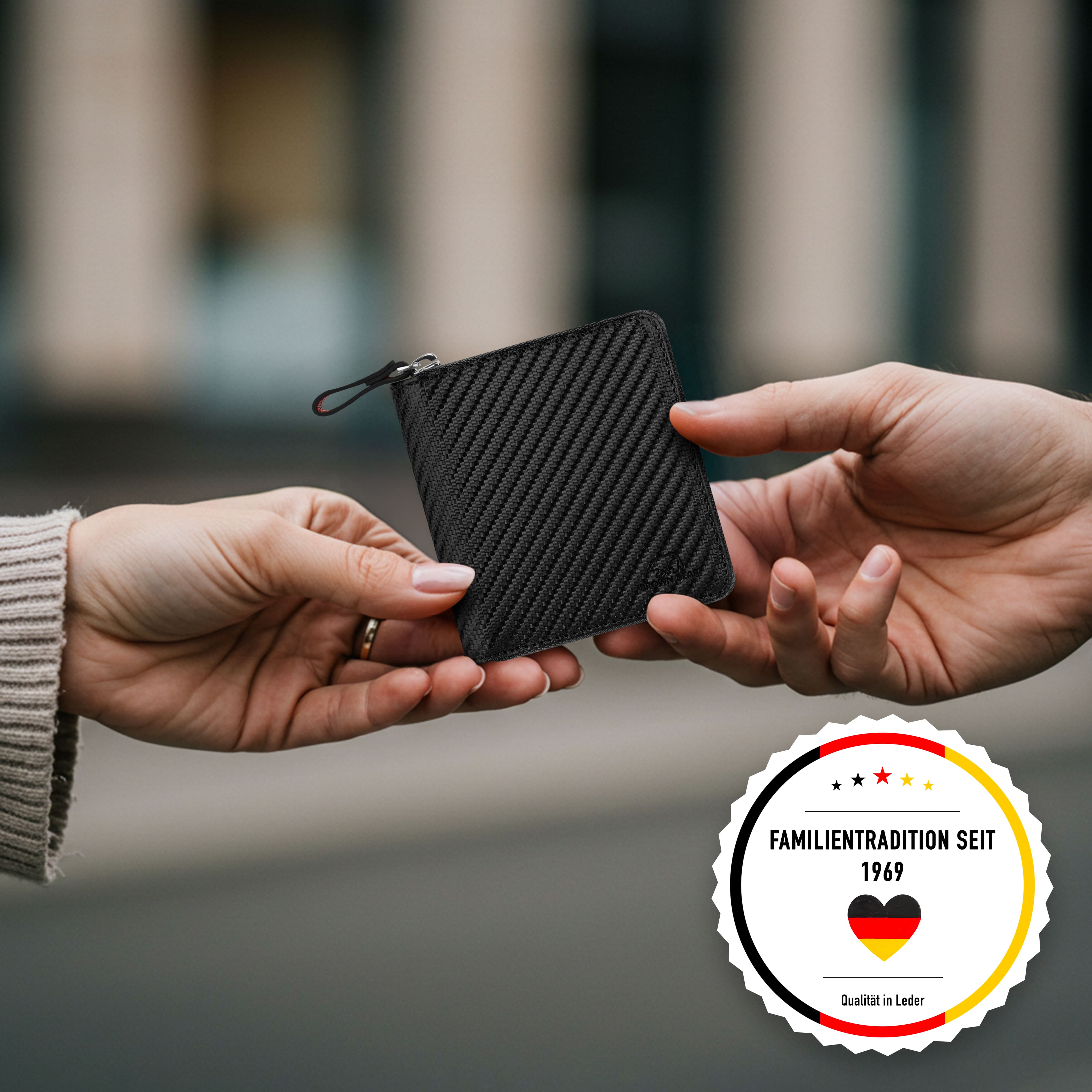 Mit den Maßen ca. 9,5 × 10 × 2 cm passt das Zip-Wallet bequem in Jacken-, Hosen- oder Sakkotaschen. Das Carré-Design wirkt modern und zeitlos zugleich – eine stilvolle Kombination aus Funktion und Eleganz.