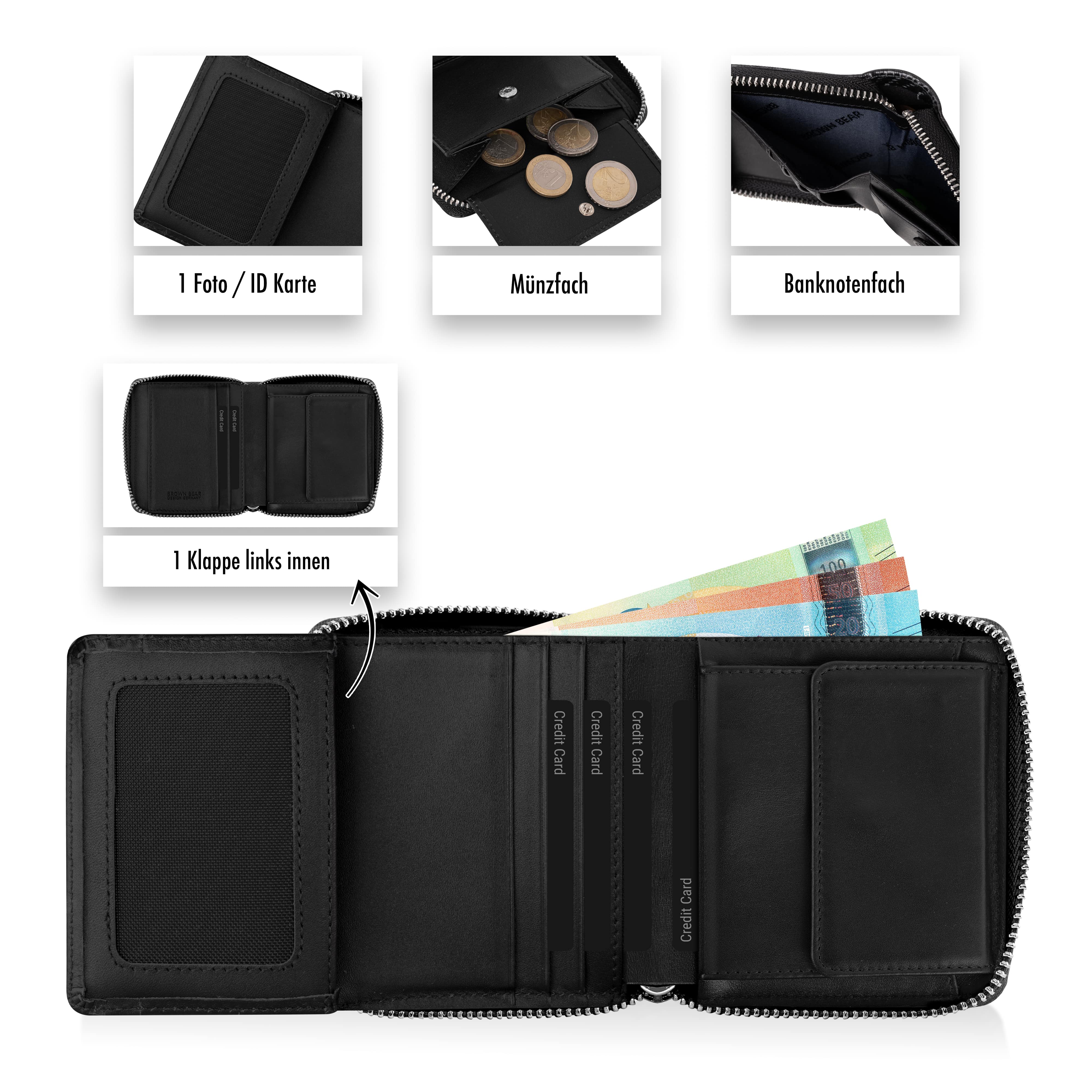 Das kompakte Slim Wallet bietet Platz für 7 Kartenfächer, ein Netzfach für Ausweis oder Foto, ein Geldscheinfach sowie ein Münzfach mit Druckknopf.